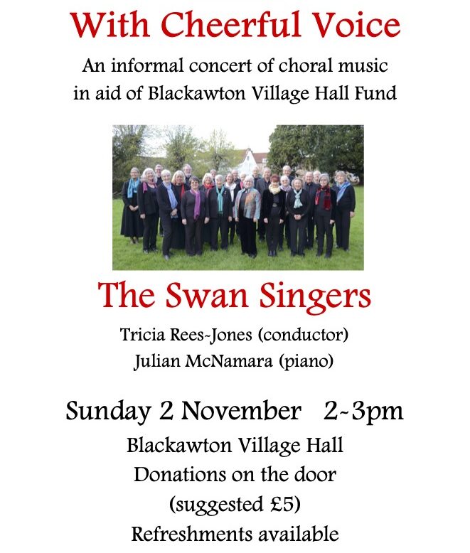 Sun 2 November, 2pm Village Hall, Blackawton A reduced tour programme, with some light-hearted favourites. Donations on the door, cream teas after the concert.